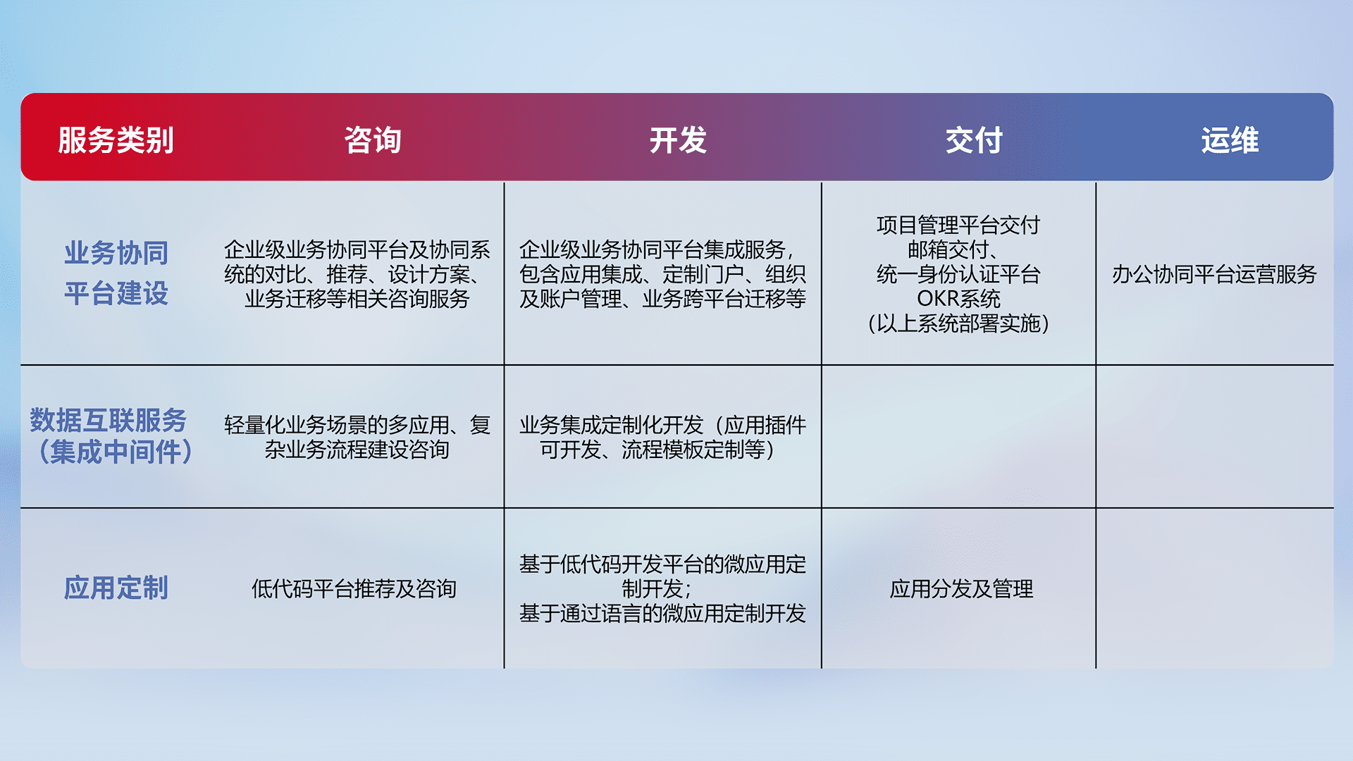 针对钉钉、、、、企微、、IDaas等平台级产品提供产品的规划、、、方案、、、、交付、、、、定制化开发等服务,,实现如统一协同办公、、、、智能客户服务、、、、混合会议管理、、智能数据查询、、等业务场景,,实现数字化转型。。